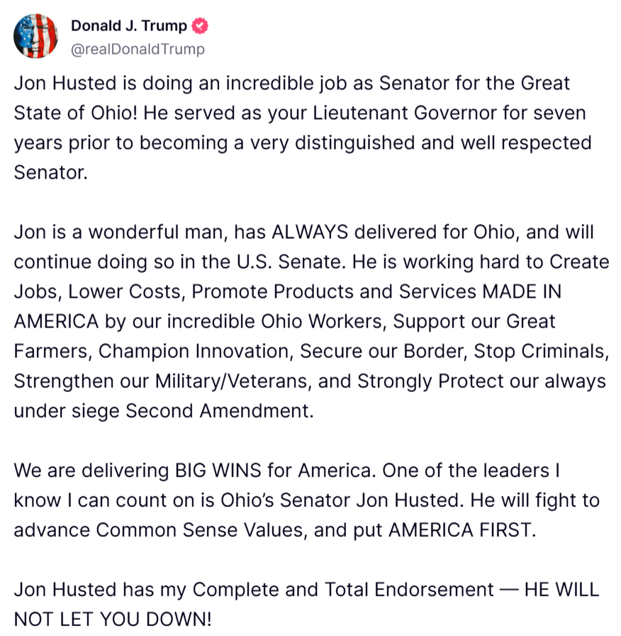 (COLUMBUS, Ohio) – Today, President Donald J. Trump endorsed Senator Jon Husted for reelection, praising his unwavering commitment to advancing the America First agenda in Ohio. President Trump emphasized his trust in Husted to secure the border, fight inflation for hardworking families, and champion common-sense values.